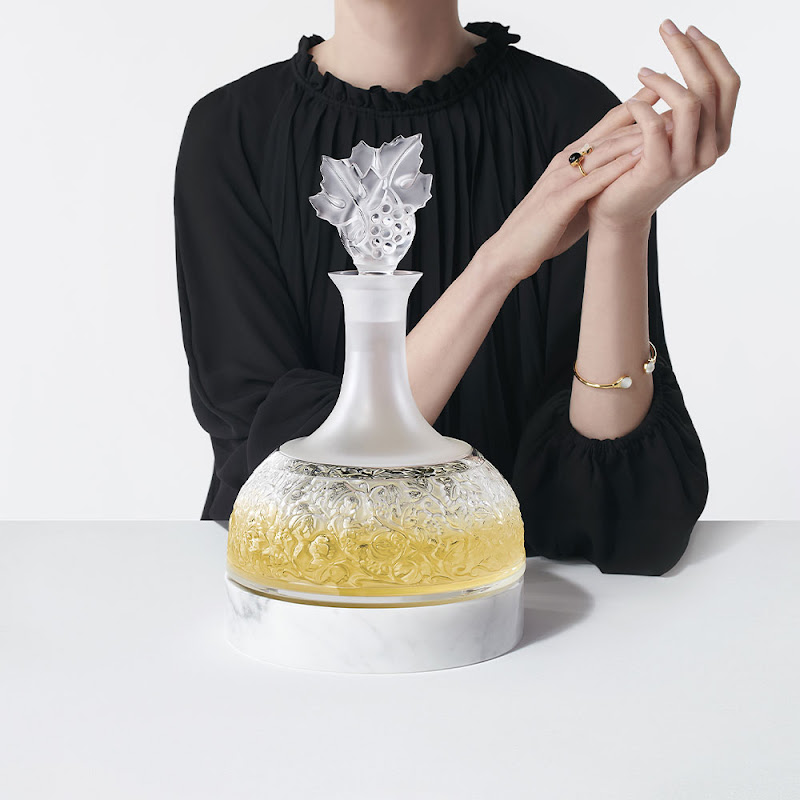 Highlighted by satin-finished crystal, a frieze of grapes and vine leaves run through this exceptional object, crowned with a stopper carved with graphic stripes.