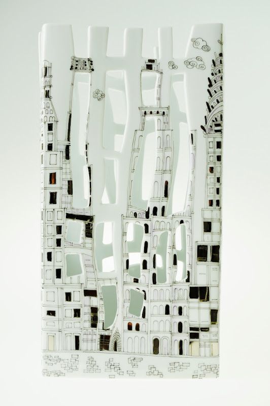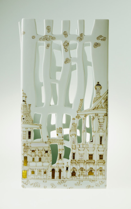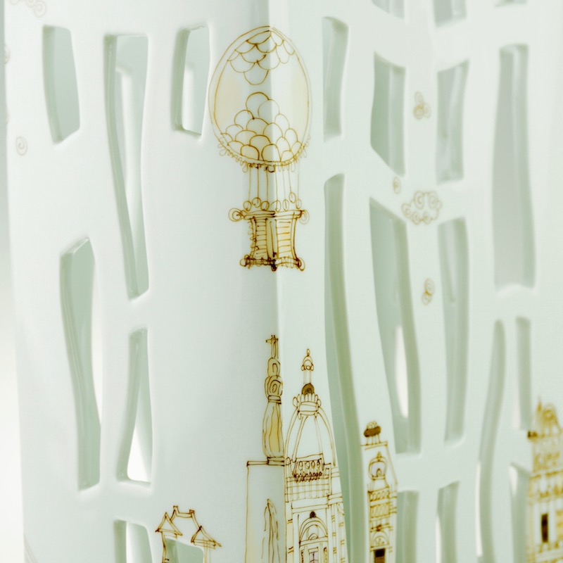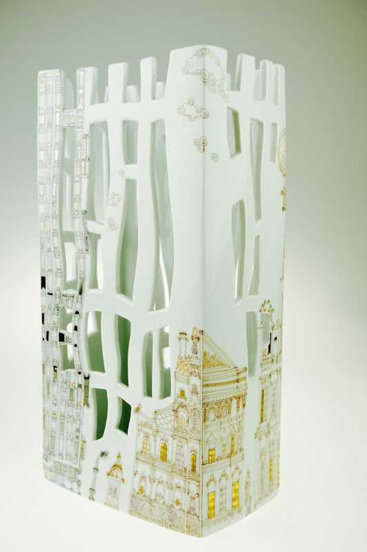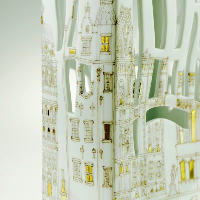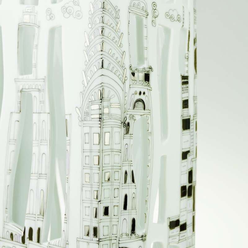 Fully handmade series of porcelain vases, decorated by hand with artist's impression of the cities Budapest and New York.
