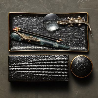 Meticulously handcrafted from porcelain with 24K gold, the Crocodile round box completes a whimsical desktop collection that is complex in color, rich in texture and global in design