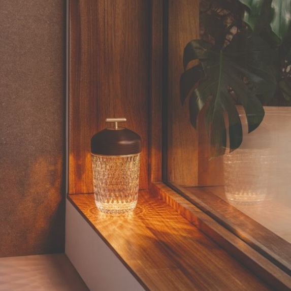 The portable lamp, in clear crystal combined with dark wood, is one of the most emblematic objects in the Folia collection, and in Saint-Louis lighting in general. It is recognisable by its pure shapes, its size rich in deep bevels and its luminous signature.