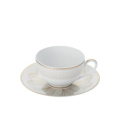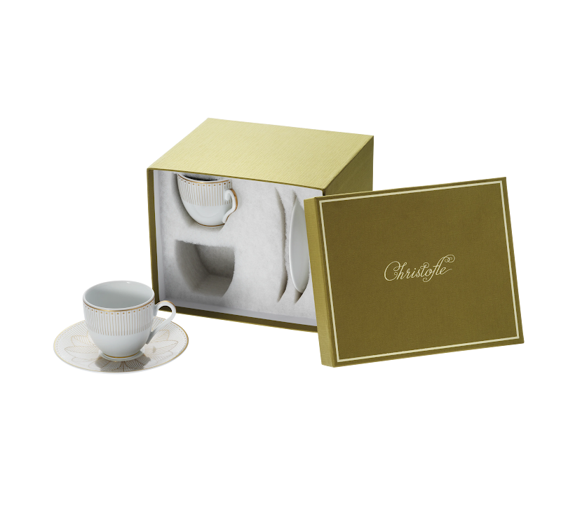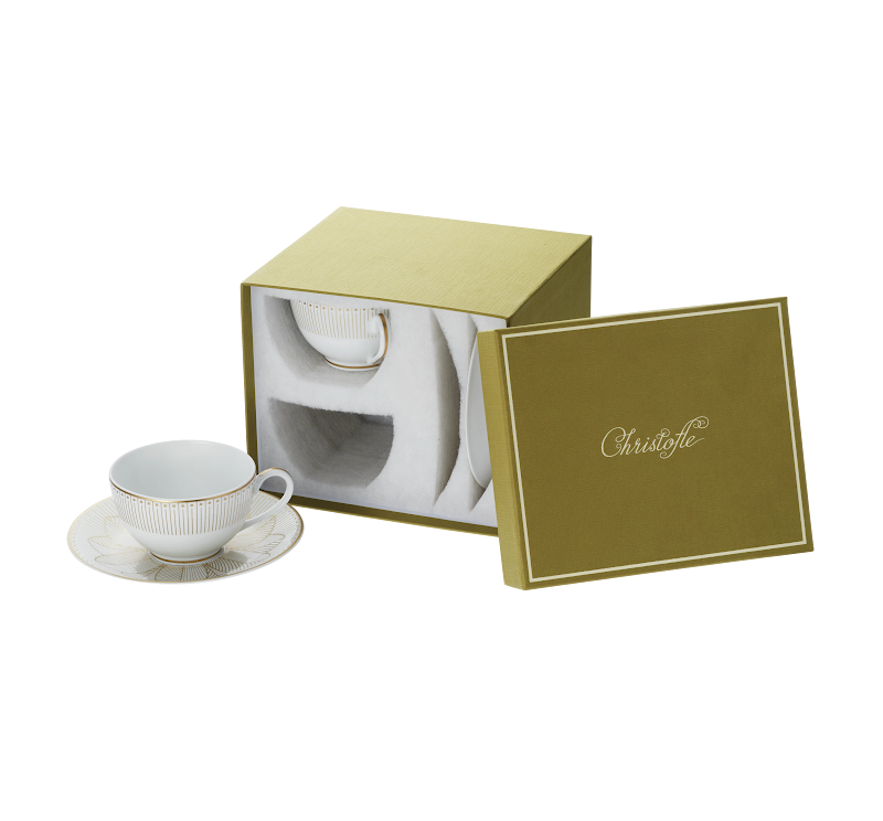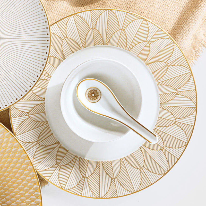 The pattern is inpired by the traditional Malmaison model, but has a modern, contemporary appearance. Each piece has its own decoration and thus allows you to vary your table according to the moments of tasting. The set contains 6 pieces in two versions, one platinium and one gold