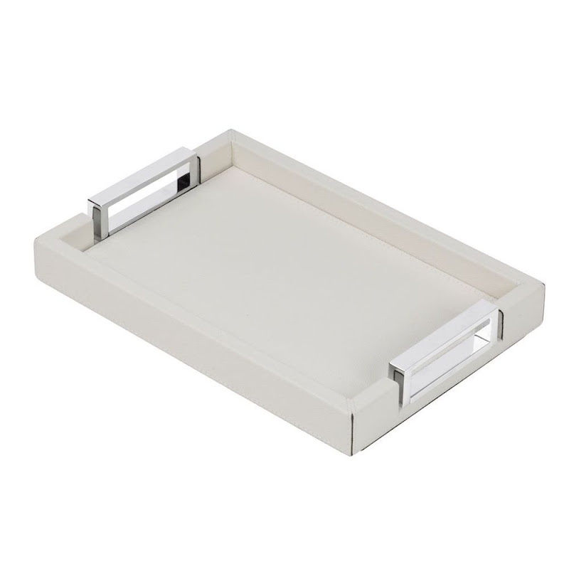 Handcrafted wooden trays, covered in leather. The handles are made of metal in chrome metal finish.