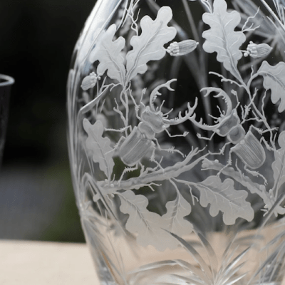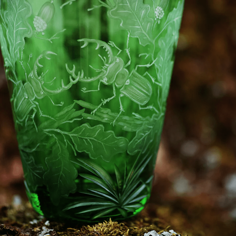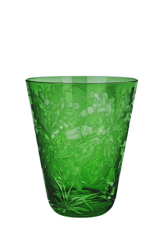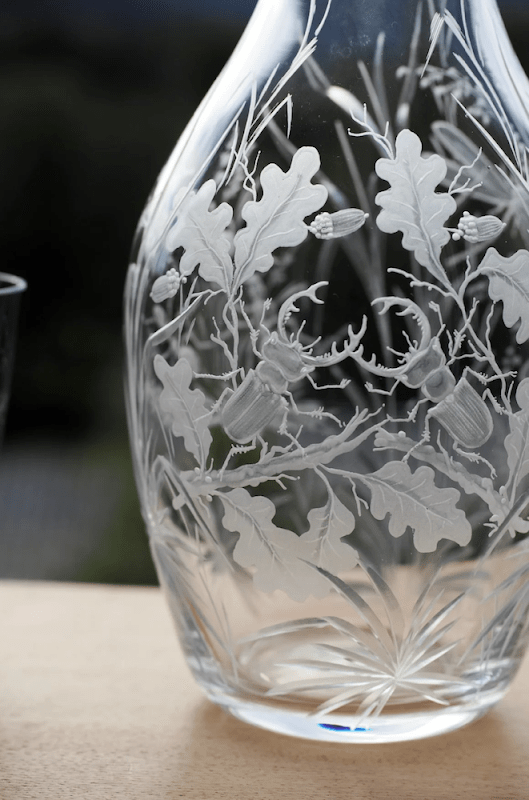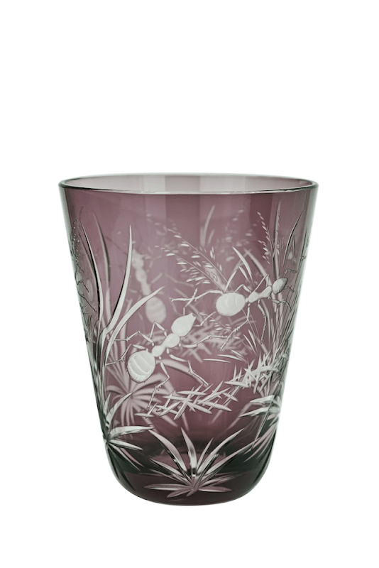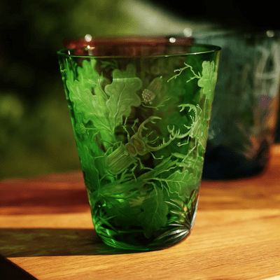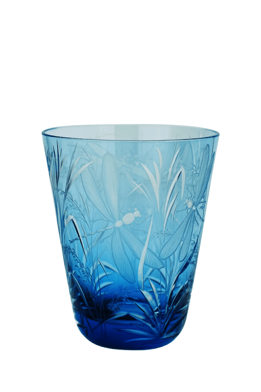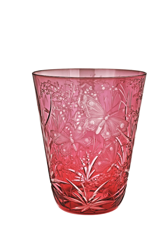 The overlay glass consists of clear glass, cased by a fine layer of colored glass. The two layers come together before blowing the hot glass item into shape. Once the glass is blown, the master cutter takes over: the cutting wheels swiftly cut through the colored layer, revealing the clear glass underneath.
