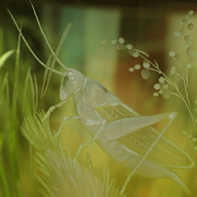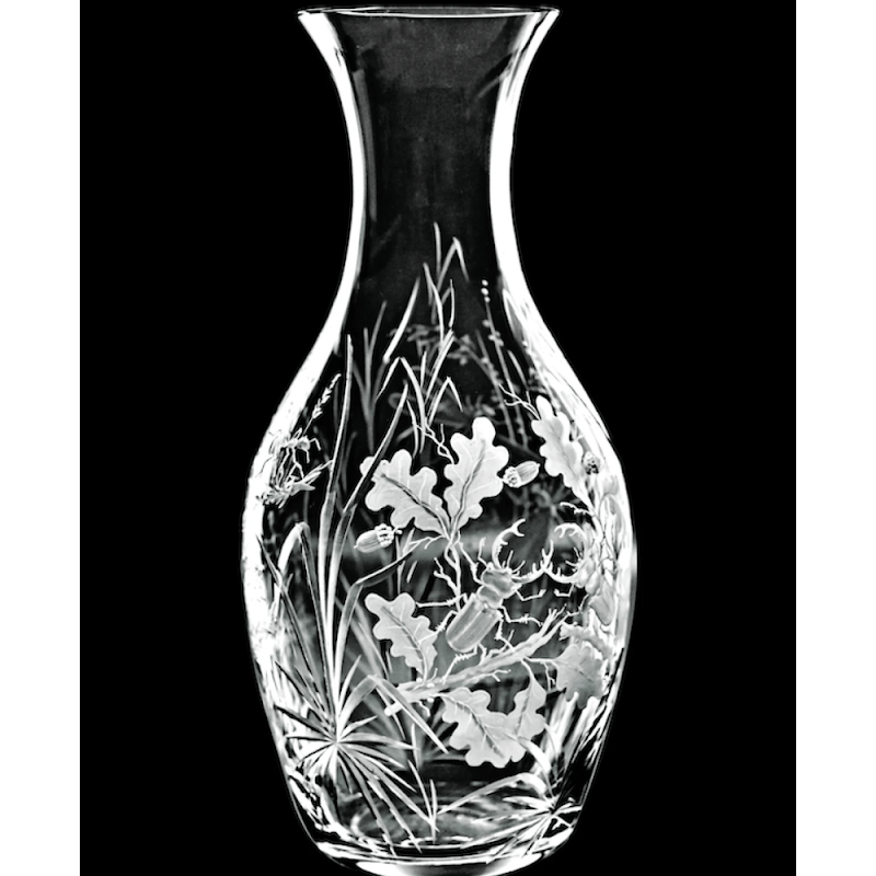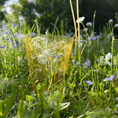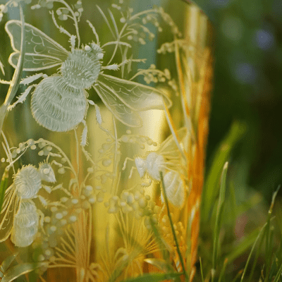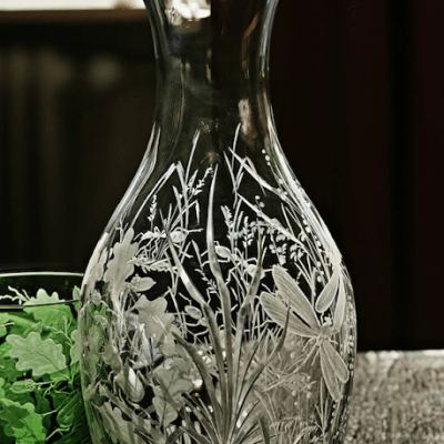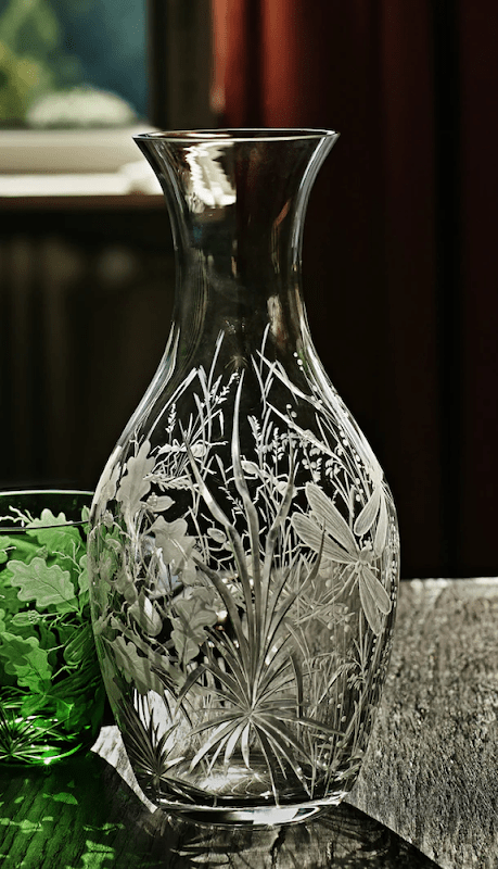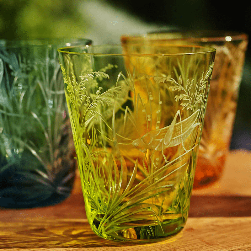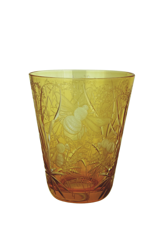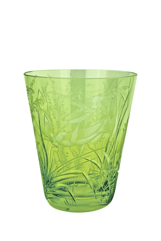 The overlay glass consists of clear glass, cased by a fine layer of colored glass. The two layers come together before blowing the hot glass item into shape. Once the glass is blown, the master cutter takes over: the cutting wheels swiftly cut through the colored layer, revealing the clear glass underneath.