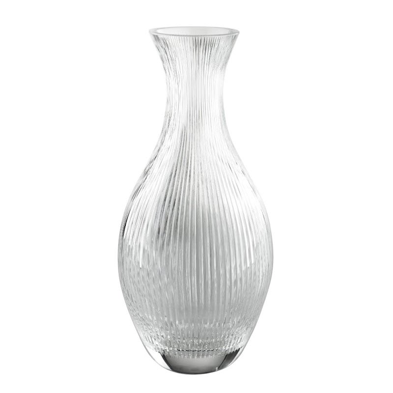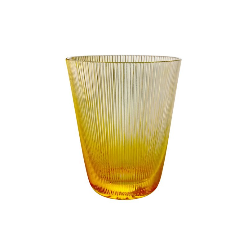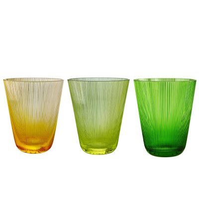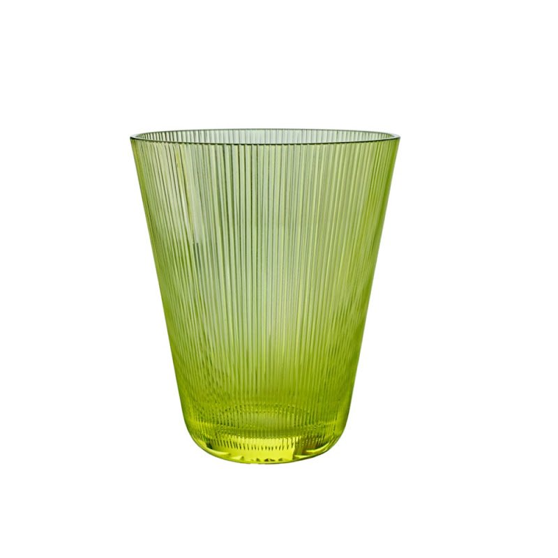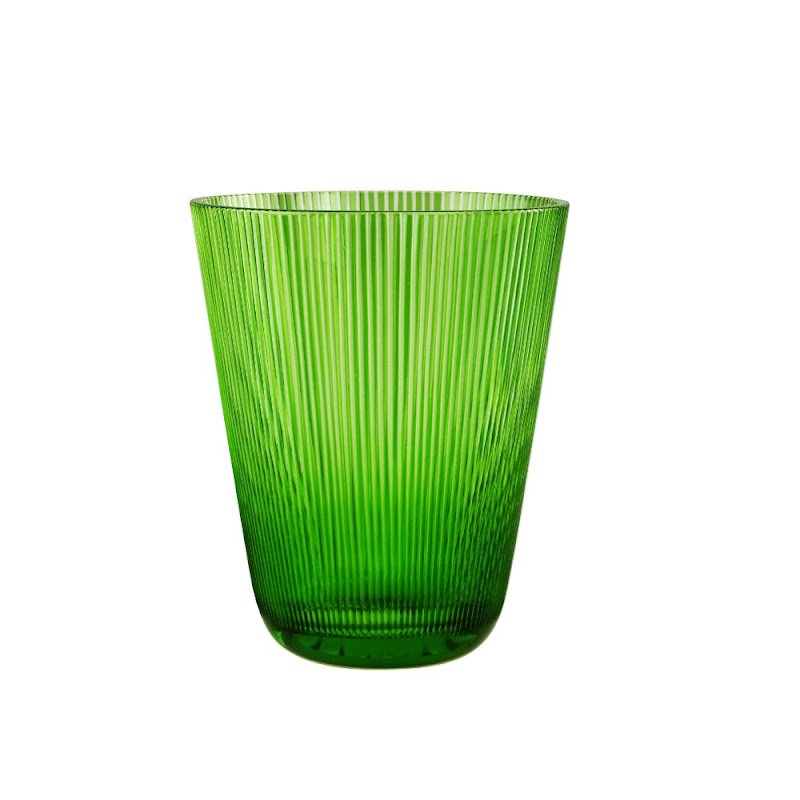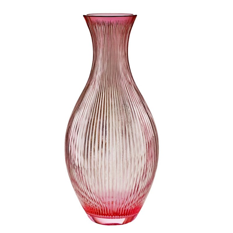 The overlay glass consists of clear glass, cased by a fine layer of colored glass. The two layers come together before blowing the hot glass item into shape. Once the glass is blown, the master cutter takes over: the cutting wheels swiftly cut through the colored layer, revealing the clear glass underneath