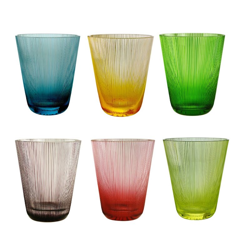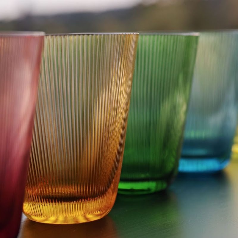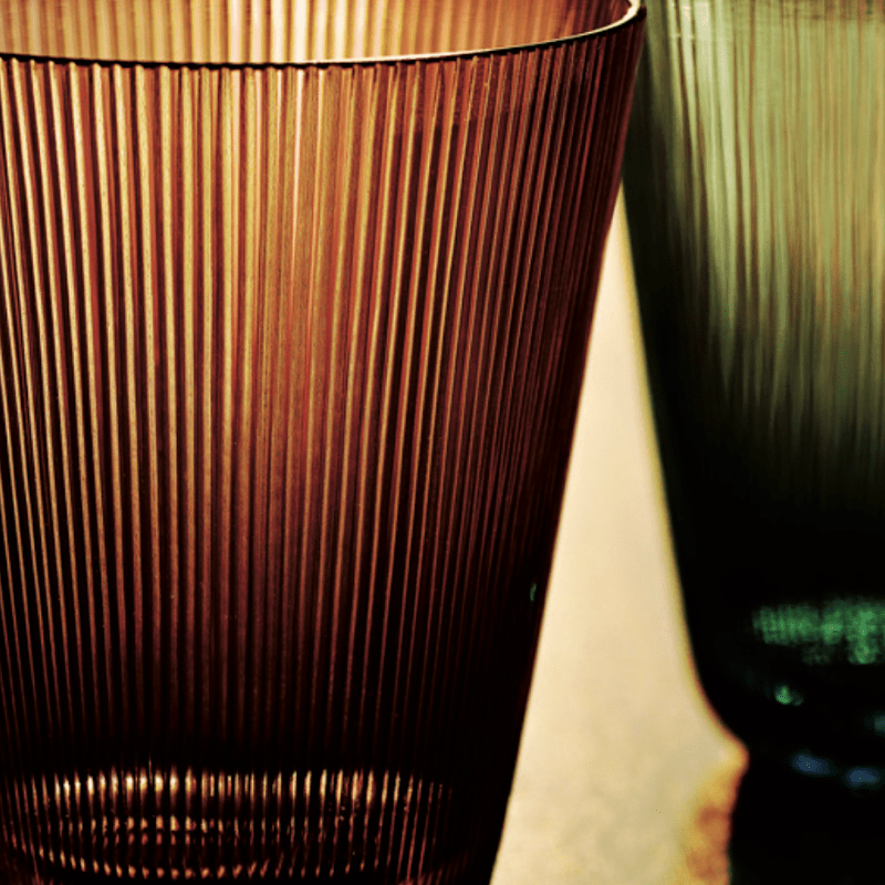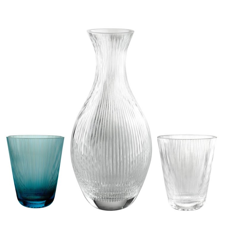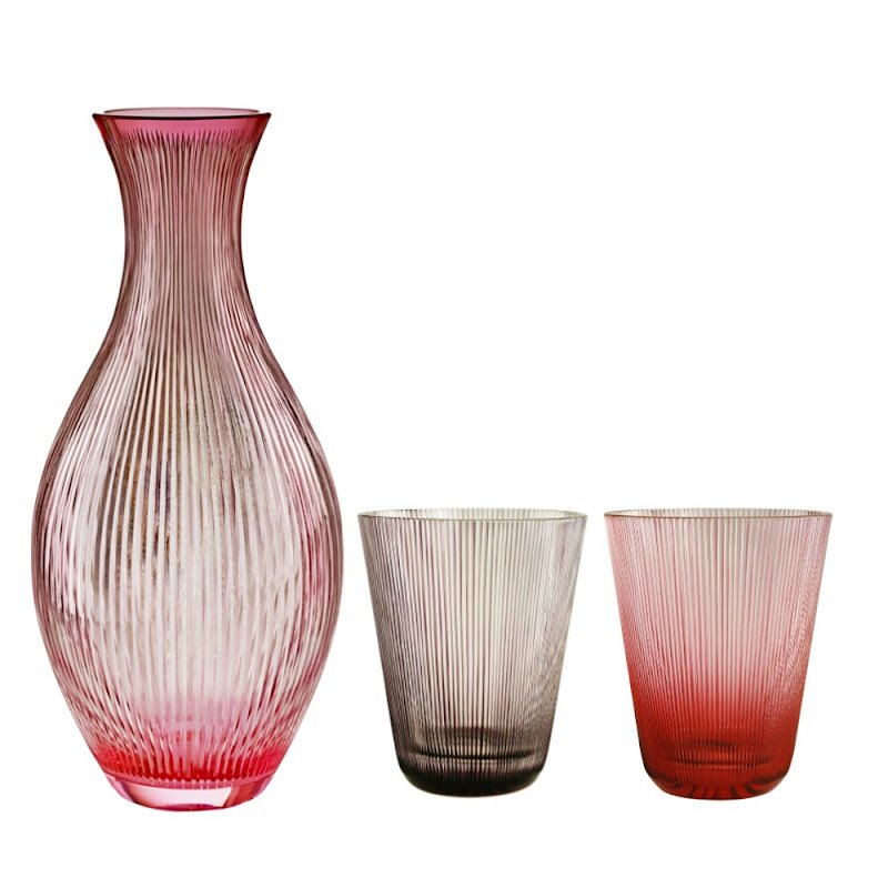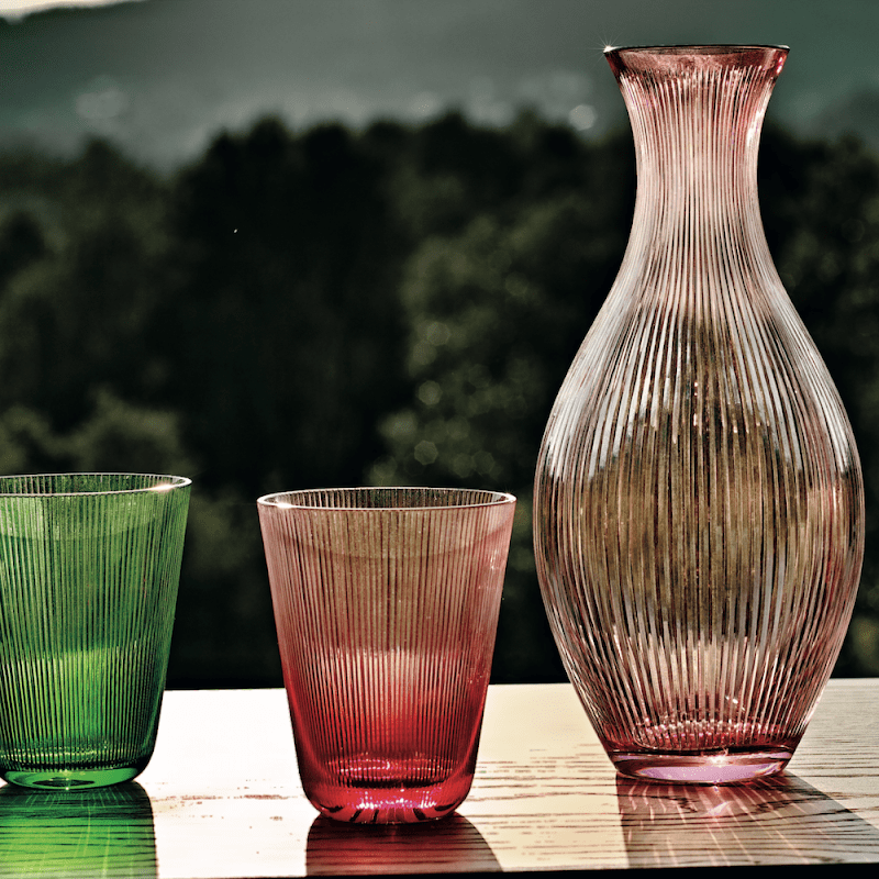 The overlay glass consists of clear glass, cased by a fine layer of colored glass. The two layers come together before blowing the hot glass item into shape. Once the glass is blown, the master cutter takes over: the cutting wheels swiftly cut through the colored layer, revealing the clear glass underneath
