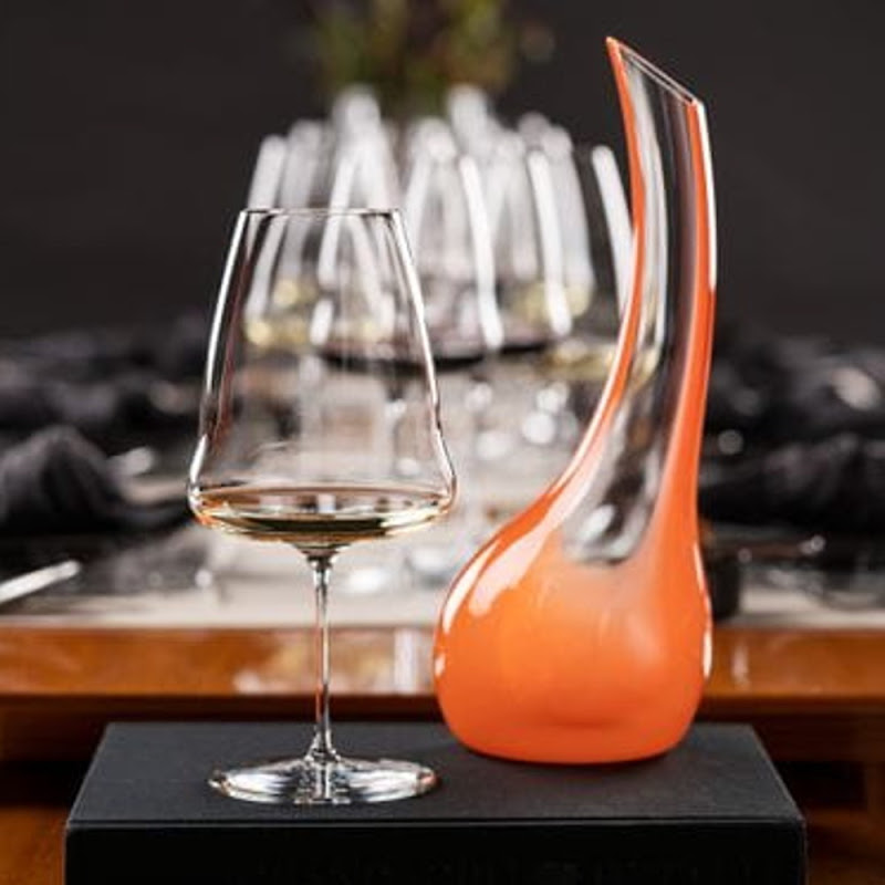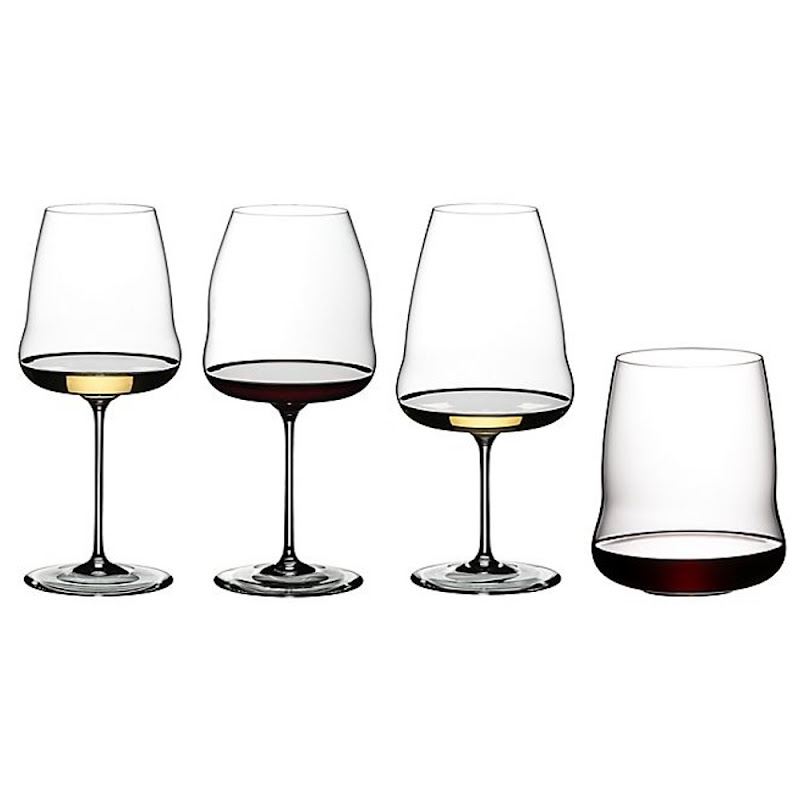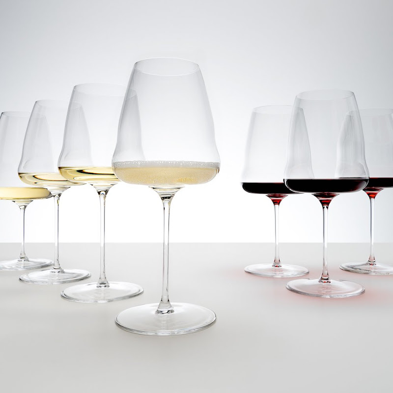 These glasses have a flat and stretched bottom, with a wing-like shape to increase the surface area between wine and air, which increases the levels of evaporation and develops a greater intensity of aroma. When positioning one’s head to the glass, the nose is closer and is exposed to the wider surface of the wine. However, this alone would not fully deliver the optimal aroma of each grape variety and so, to capture the delicate layered aromas, it was necessary to curve the glass walls and to correctly calibrate the opening of each glass with its ideal rim diameter. Thus 7 different glasses were developed to represent the most popular grape varietals.