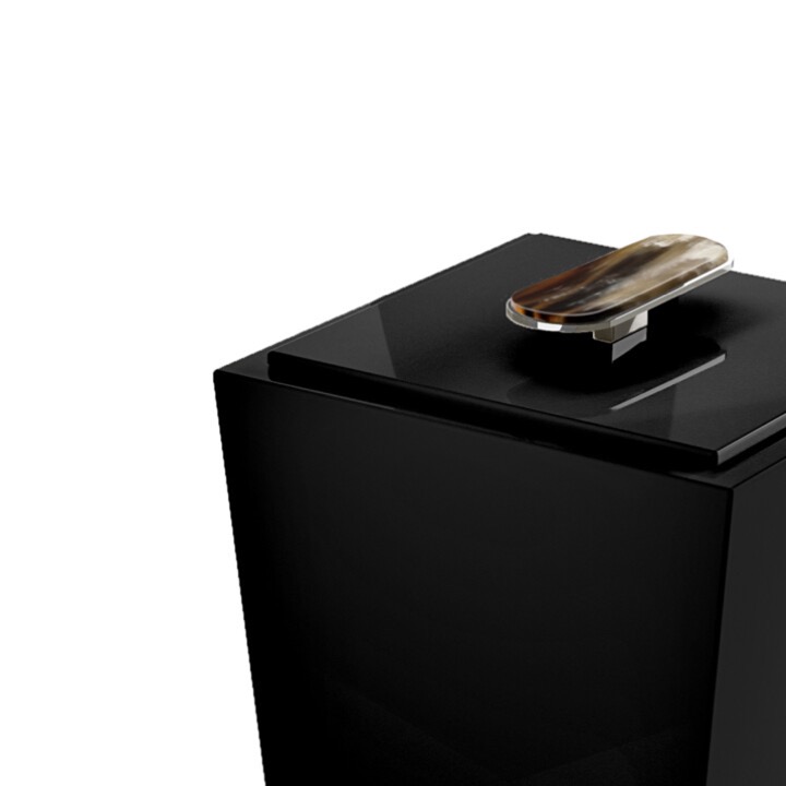 Wood with lacquered black gloss finish. The handle of the lid is made of horn and chromed brass