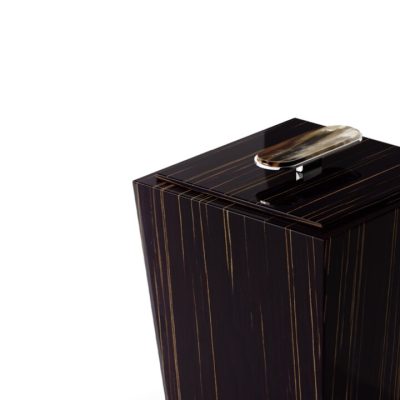 Glossy Ebony. The handle of the lid is made of horn and chromed brass