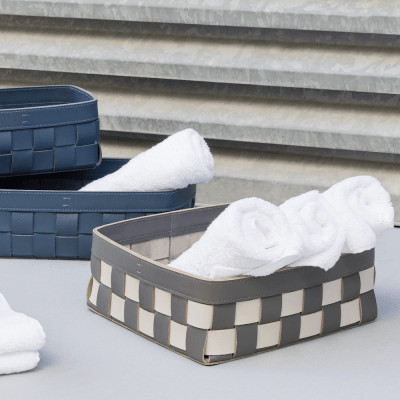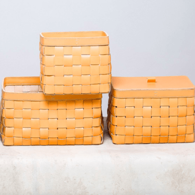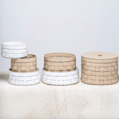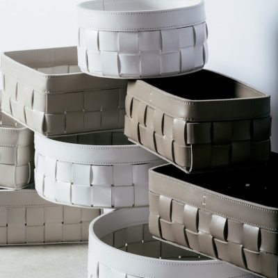 This beautiful leather basket comes in round, rectangular and square, with or without cover, in various sizes and colours.