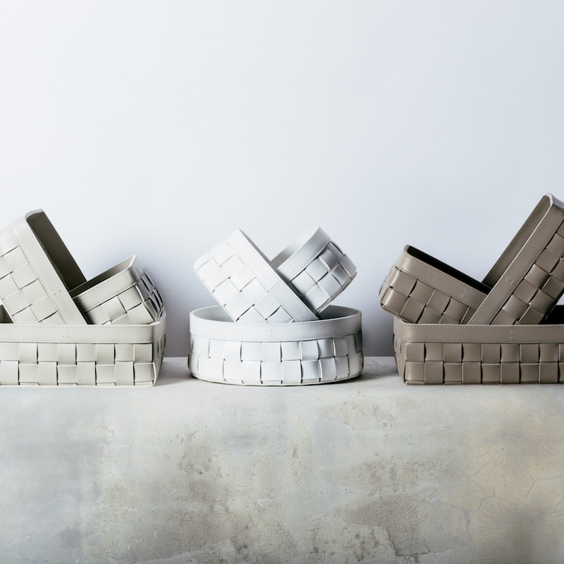 This beautiful leather basket comes in round, rectangular and square, with or without cover, in various sizes and colours.