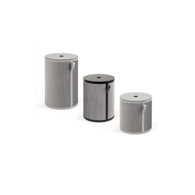 Round basket with cover, made in recycled Antibes leather.