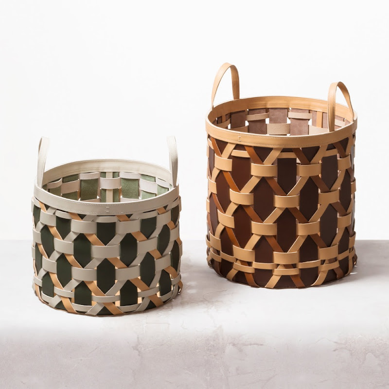 Water resistant braided multi colour saddle leather baskets with or without handles.