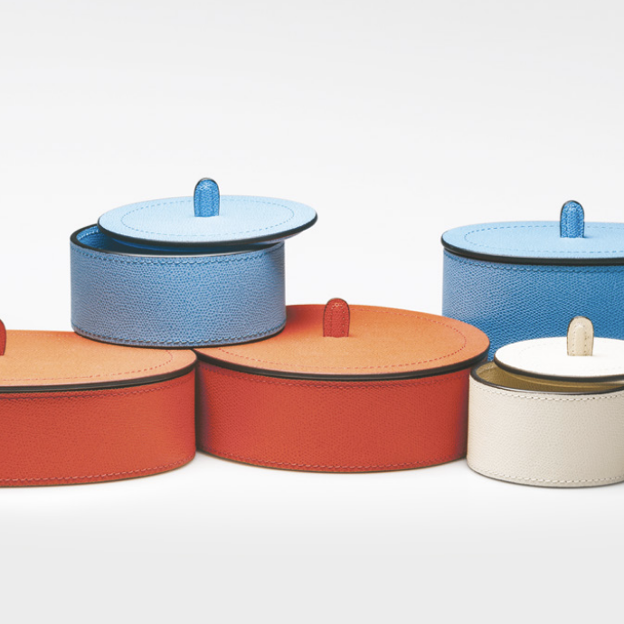 Leather covered round or oval boxes with lid.