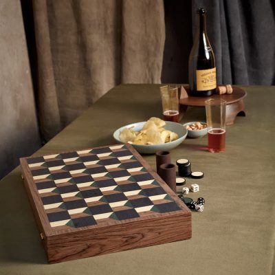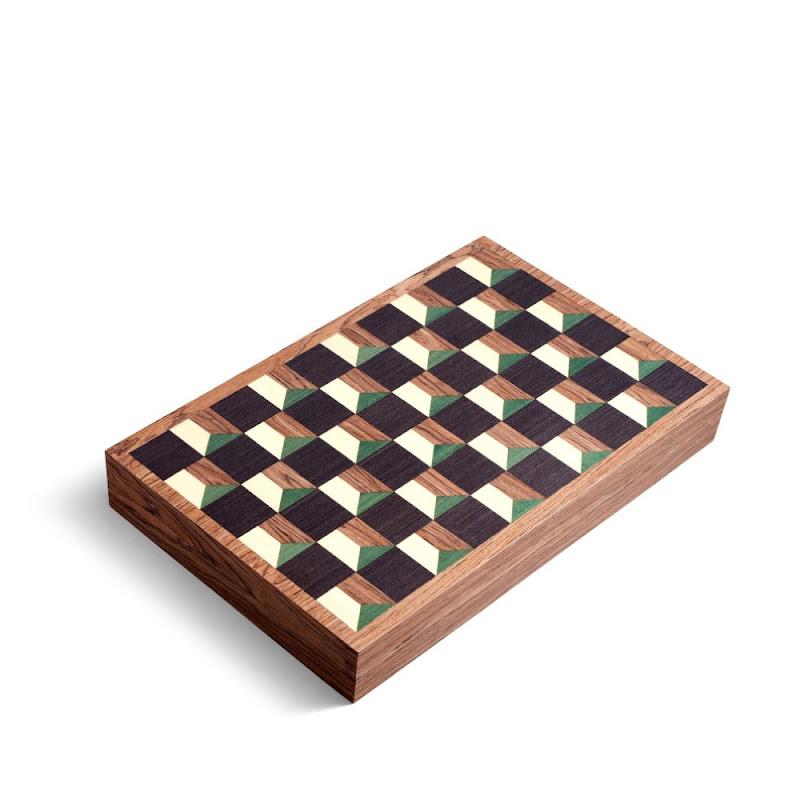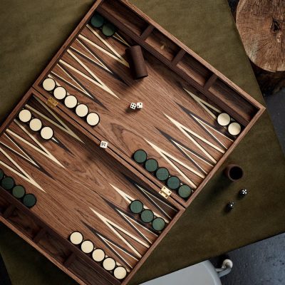A Traditional backgammon set hand-crafted with inlaid natural wood, ivory pieces and suede backing
