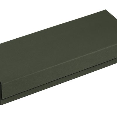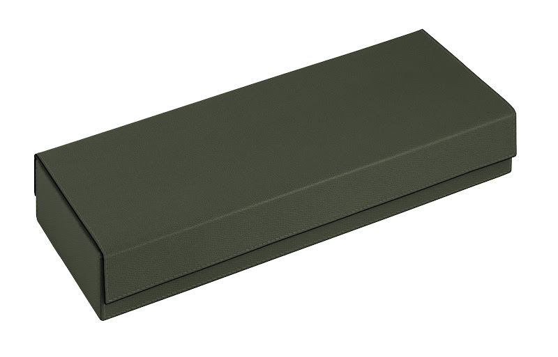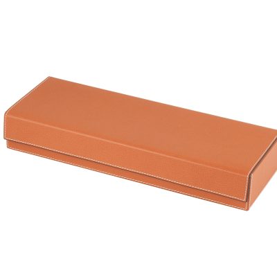 Leather covered wooden case, with hinged lid and magnetic closing.