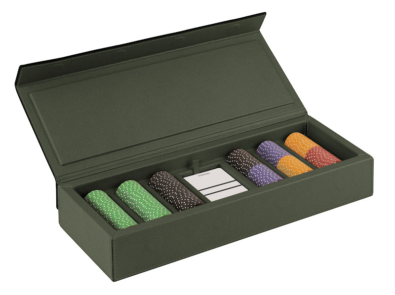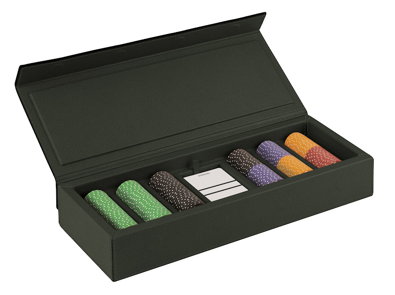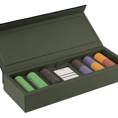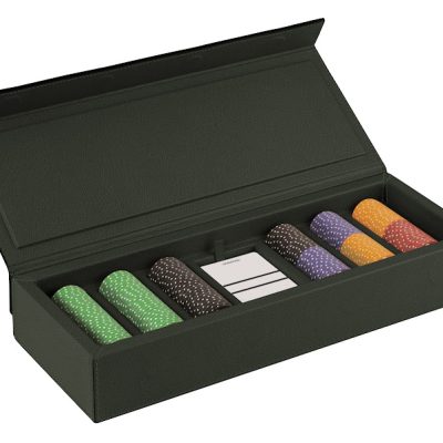 Includes 2 decks of high quality playing cards and poker chips with 5 denominations.