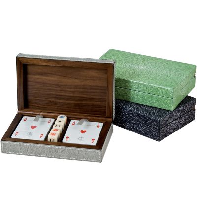Leather covered walnut case. Includes 2 decks of high quality playing cards and 5 poker dice.