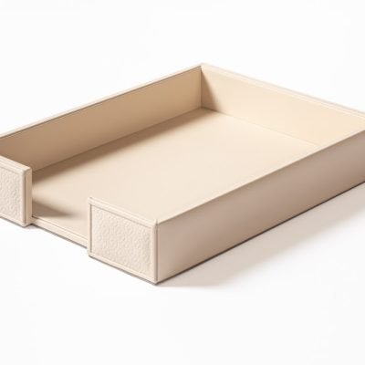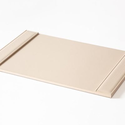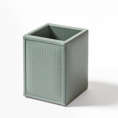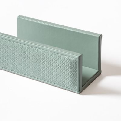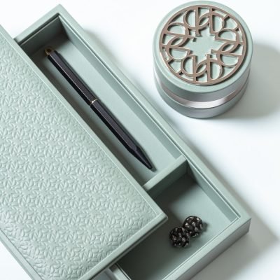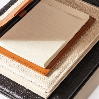 Collection of desk set accessories, covered with leather, featuring the ELIE SAAB monogram pattern.