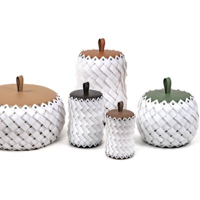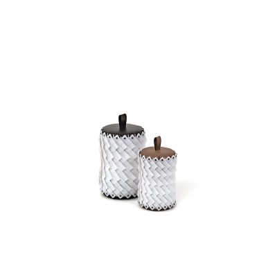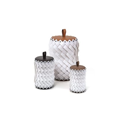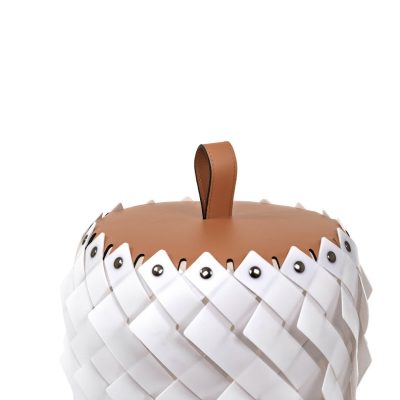 Made with a hand-woven plastic moduls, the base and top are made with recycled leather.
