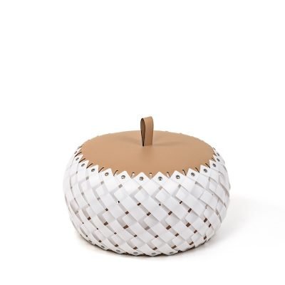 Made with a hand-woven plastic moduls, the base and top are made with recycled leather.