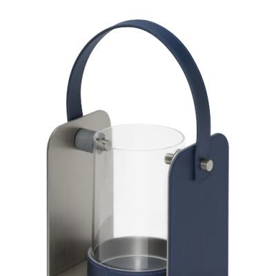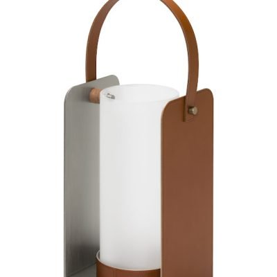 Aluminium structure featuring a saddle leather decorative external cover and a space to host a borosilicate glass tube, available either in a transparent or white frosted version