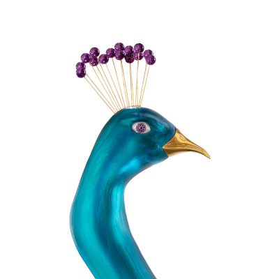 The eyes of the peacock are made of amethysts and white diamonds, mounted on yellow gold, the crest of violet crystal beads and the beak of gilded bronze.