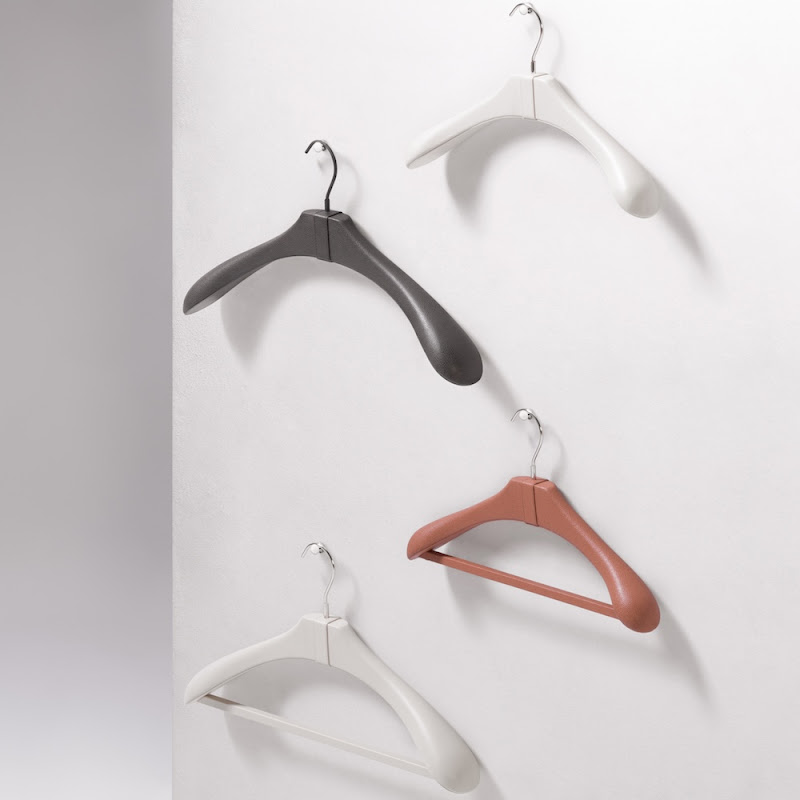 The hangers are available with or without trousers bar and on request with clips for trousers or skirt.