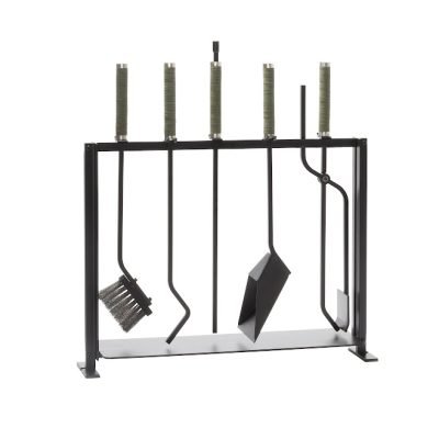 Dark-stained metal tools with saddle leather grips. Metal support with bronze finish included