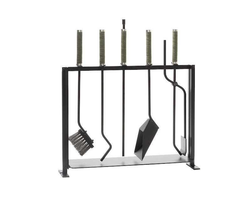 Dark-stained metal tools with saddle leather grips. Metal support with bronze finish included
