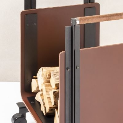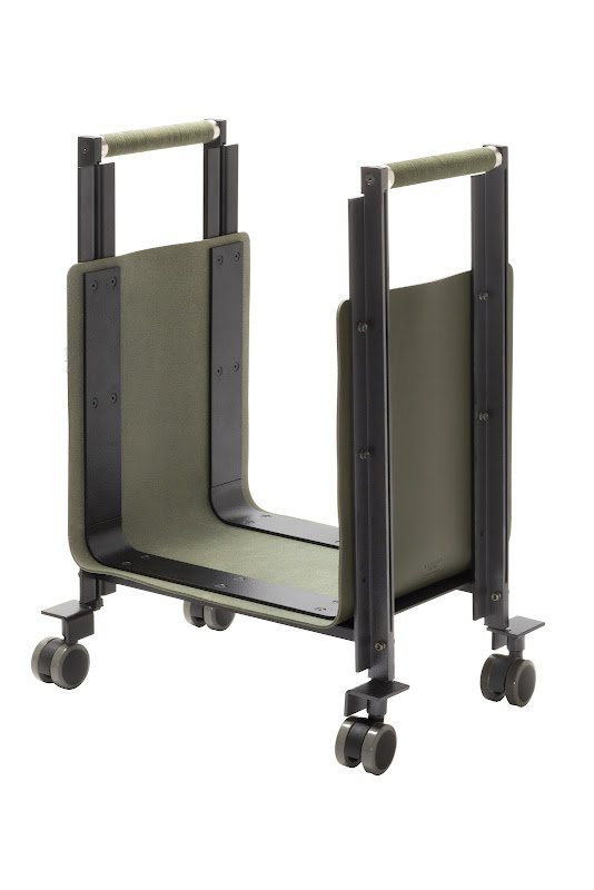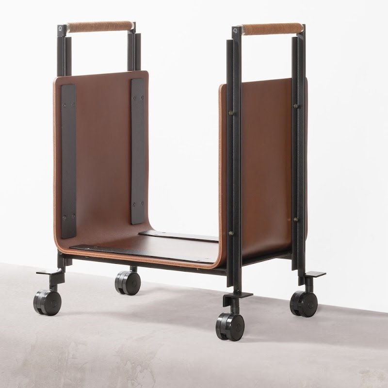 Dark-stained metal support featuring fine saddle leather inserts. Provided with omnidirectional wheels.