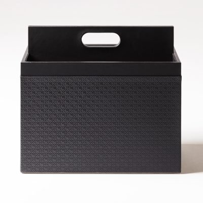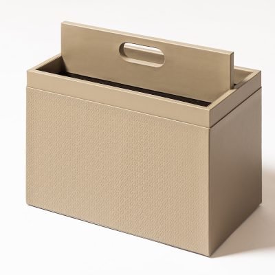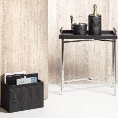 Wooden structure magazine holder covered with leather featuring the ELIE SAAB onogram pattern on two sides.