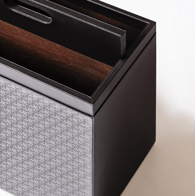 Wooden structure magazine holder covered with leather featuring the ELIE SAAB onogram pattern on two sides.