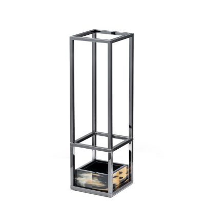 Structure in stainless steel. Base in wood with lacquered black gloss finish and dark horn inlays. Removable glass tray.