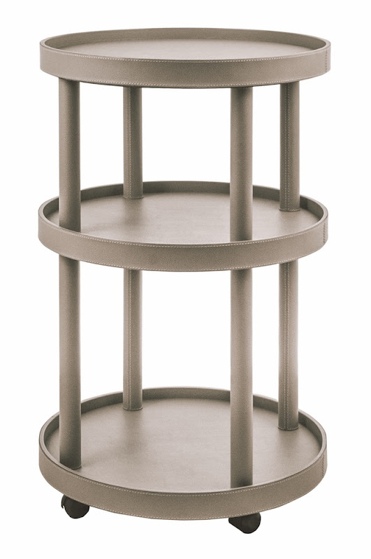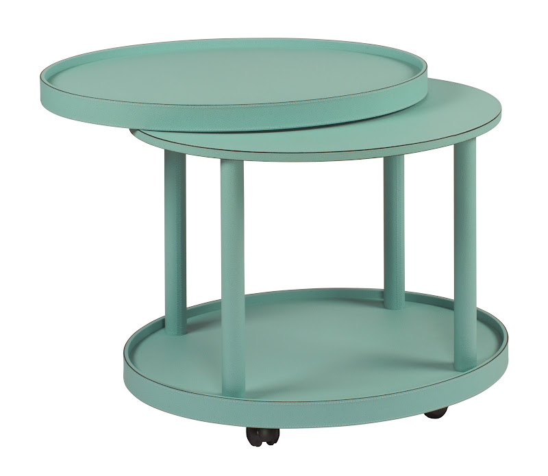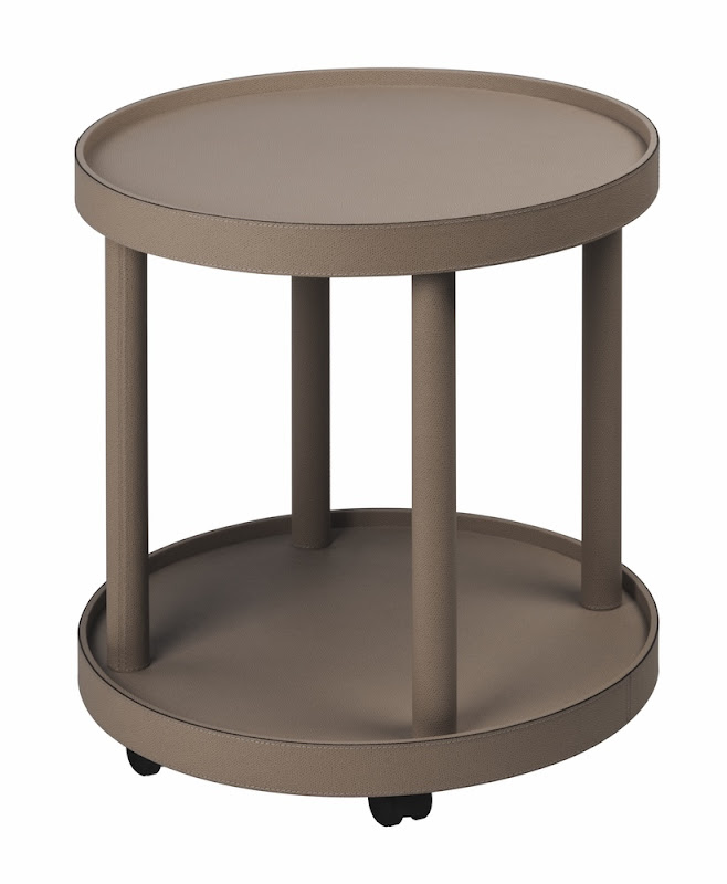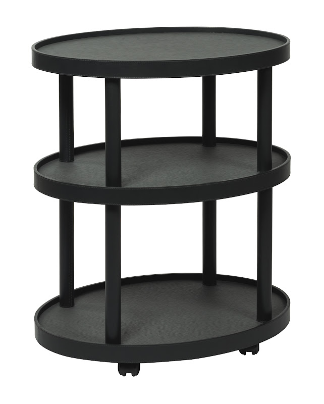 Leather covered four-wheel wood structure with removable top tray.