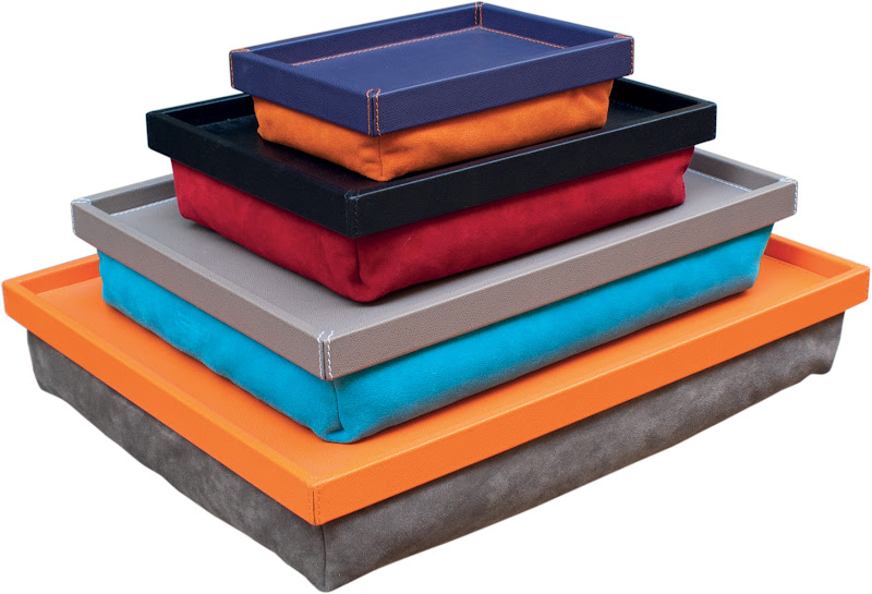The suède is available in various colours and the leather of the tray is available in many colours and various finishes.
