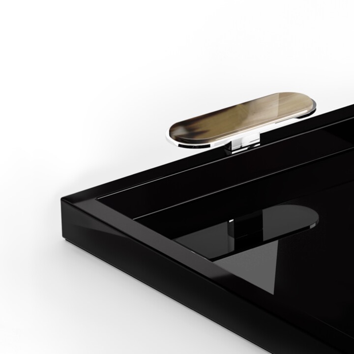 Wood with lacquered black gloss finish. Handles in horn and chromed brass