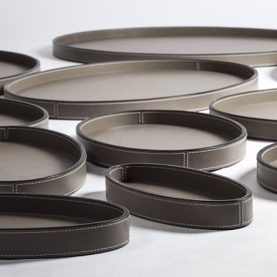 Leather covered wooden tray.