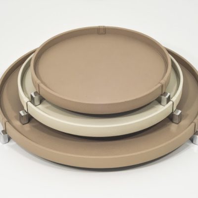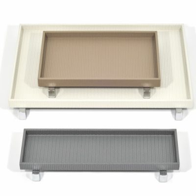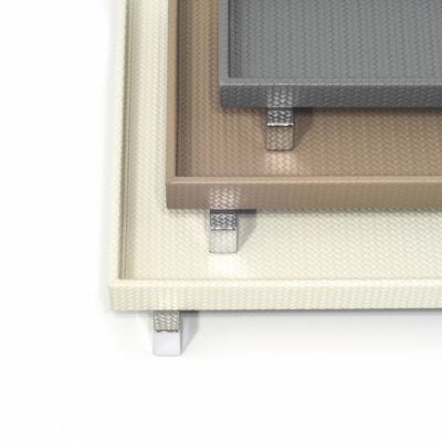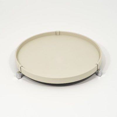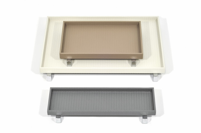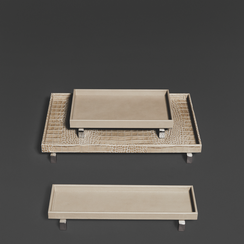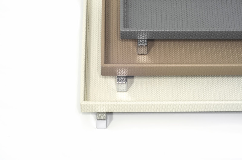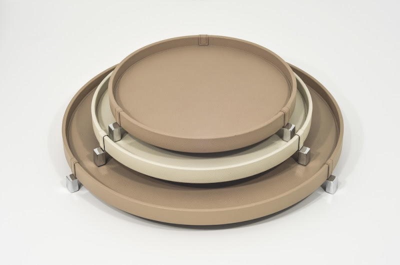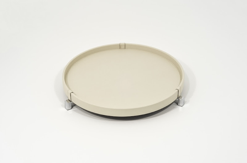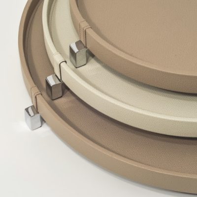Wood base covered in leather, metal feet with chrome, burnished or gold finishing