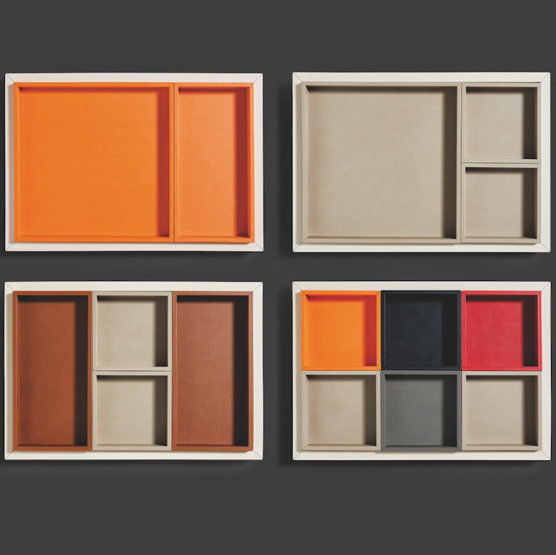 Wood trays covered in leather, available in three sizes to create different configurations.Play with colours and dimensions to adapt it to your needs