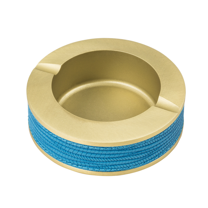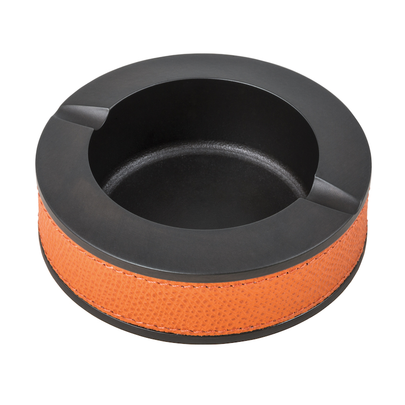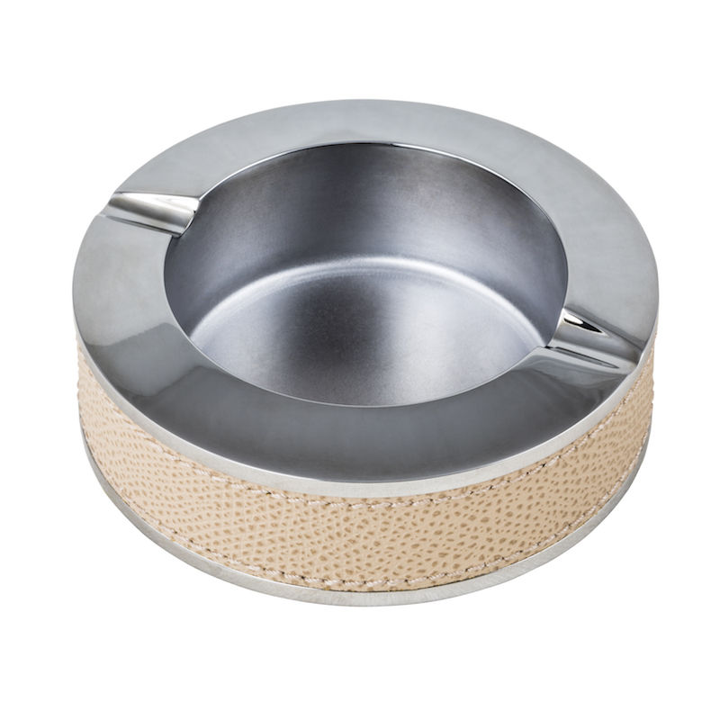 This heavyweight ashtray is carved from a solid block of metal. The sides and bottom are covered with leather