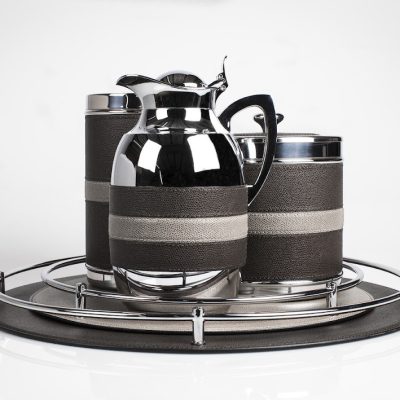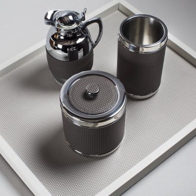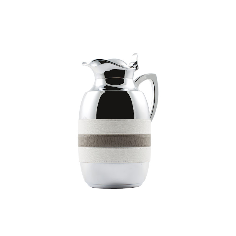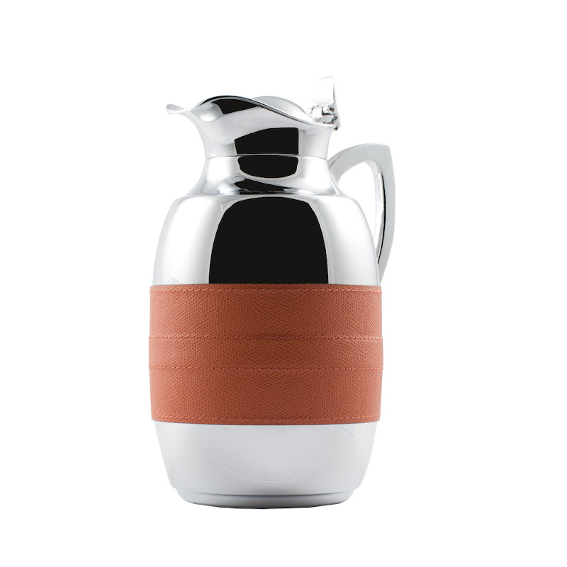 Partially leather covered thermo insulated jug, in chrome-plated brass.