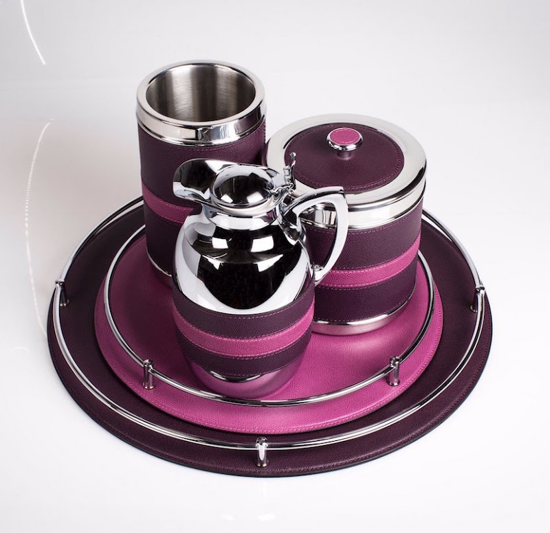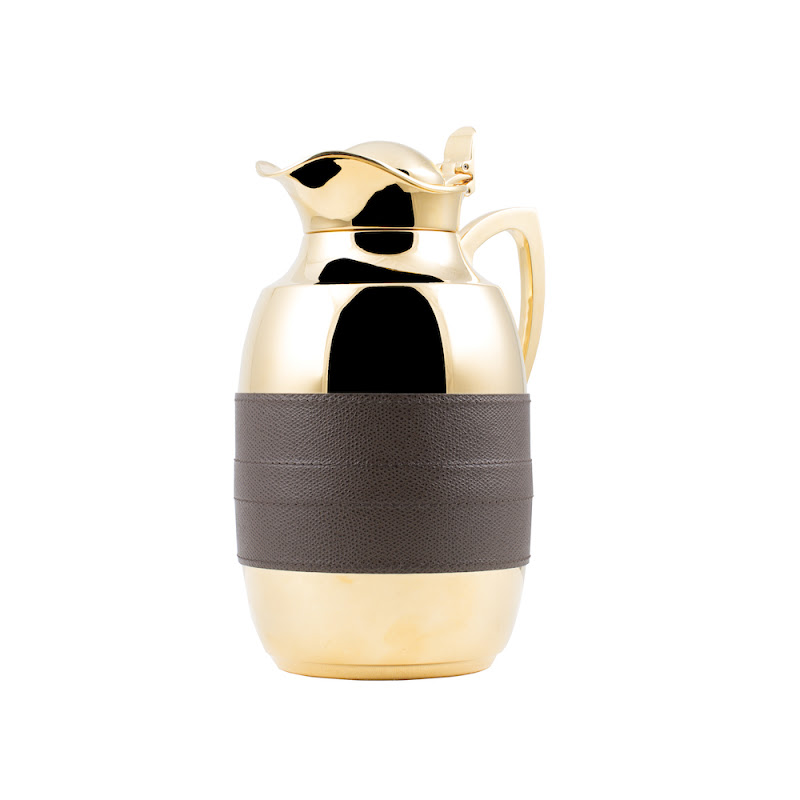 Partially leather covered thermo insulated jug, in chrome-plated brass.