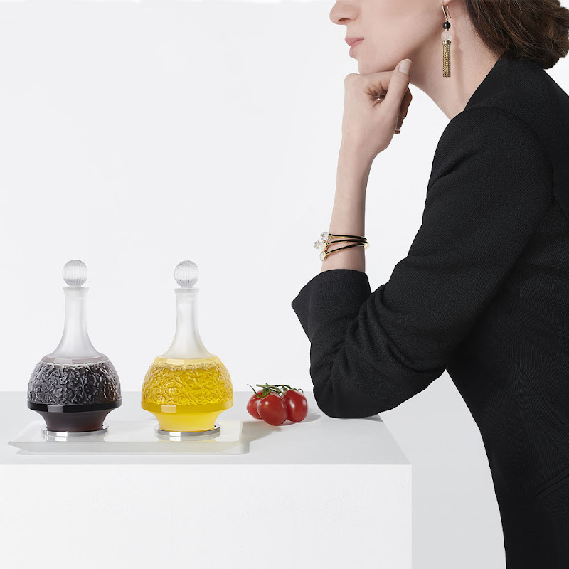 Highlighted by satin-finished crystal, a frieze of grapes and vine leaves run through this exceptional object, crowned with a stopper carved with graphic stripes.