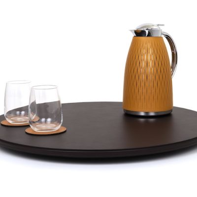 Round revolving tray made of wood, covered with leather.