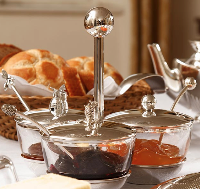 Three glass jam jars with silver plated lid ( of your choice ) in silver plated holder