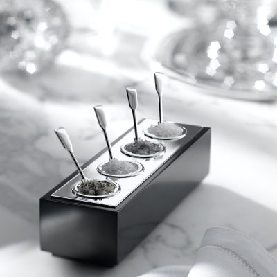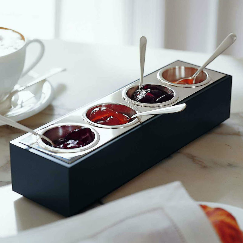In the removable dishes different kinds of jam and sugar as well as sauces can be served. The smaller version can be used for different kinds of salt