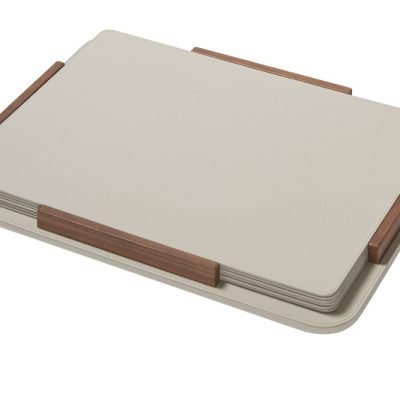 Set of 6 Pelle Frau ® all-leather placemats in leather-covered holder with walnut wood inserts.