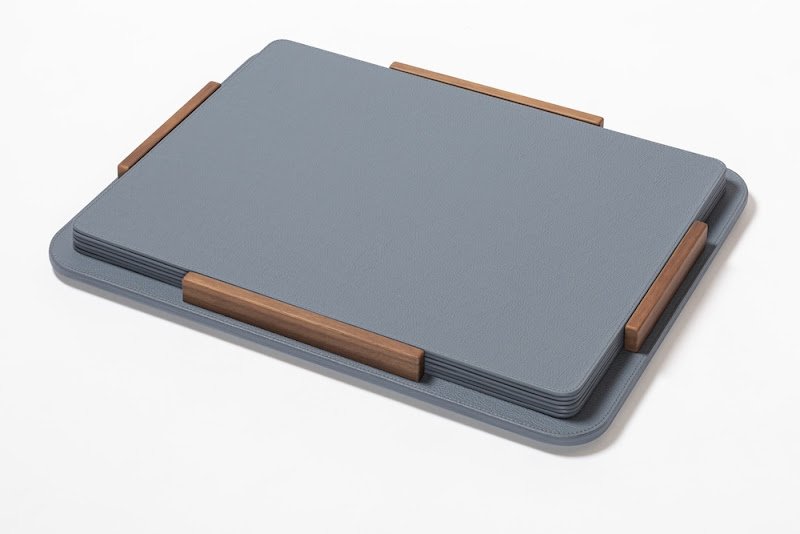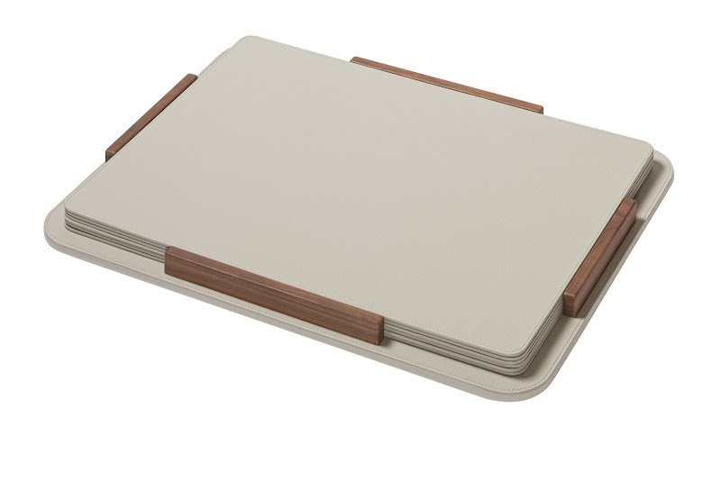 Set of 6 Pelle Frau ® all-leather placemats in leather-covered holder with walnut wood inserts.
