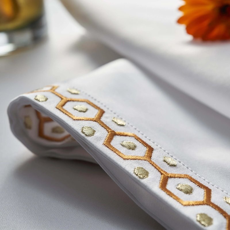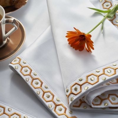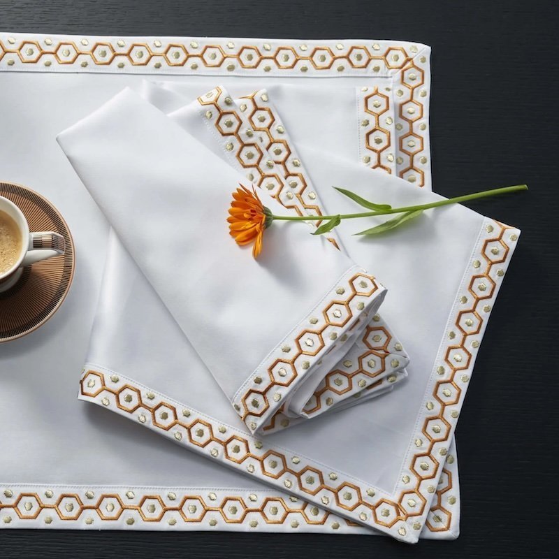 Placemats, napkins and table cloths are made to order in your preferred sizes and fabric, with embroidery in a colour of your choice